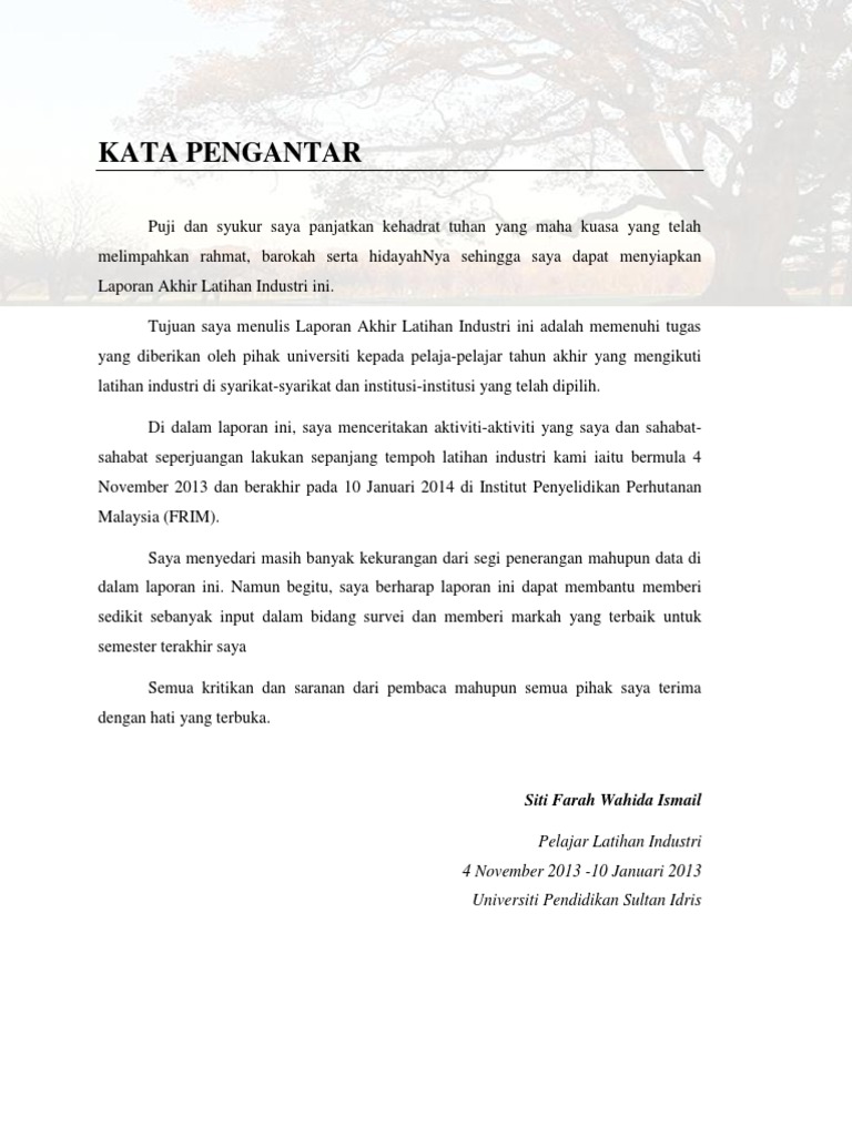 Selain itu, latihan industri telah memberi impak yang amat positif dalam membentuk dan melahirkan para pelajar yang berkebolehan dalam aspek pengurusan serta lebih. Membolehkan pihak politeknik membuat penilaian pencapaian pelajarnya dalam menjalani latihan industri. Dengan adanya buku laporan ini, para pelajar dapat memberi serba sedikit maklumat dan aktiviti yang diperolehi semasa menjalani latihan industri. 1.2 objektif laporan latihan industri apabila tamat latihan industri yang dijalankan disebuah firma tersebut itu, maka setiap pelajar diharuskan membuat atau menyediakan laporan lengkap dan mengikut piawaian yangtelah ditetapkan oleh pihak politeknik. Laporan akhir latihan industri hariz dzulhafiz bin abdul manap. Industrial training final report by iqlima damia razarous issuu. Perbadanan perpustakaan awam selangor (ppas). Pembentangan latihan industri aktiviti 7 aktiviti 6 menghasilkan sebuah jurnal menyediakan laporan penyiasatan ekonomi terima kasih belajar cara menyediakan laporan data diambil dari sistem newss membuat analisis ringkas jurnal berkaitan dengan industri pembuatan. 86 downloads 317 views 561kb size. Contoh penulisan laporan akhir latihan industri politeknik. Semoga laporan latihan laporan latihan industri ini disediakan untuk kursus kejuruteraan industri ini dapat memberi manfaat kepada saya dan juga warga ikm mekanikal (lukisan & rekabentuk), institut kemahiran mara jasin, jasin secara keseluruhannya. Latihan industri ini merupakan sebagai memenuhi sebahagian daripada syarat kursus ijazah kejuruteraan elektrik dan kursuskursus yang lain. Tarikh sebenar latihan adalah seperti ditetapkan oleh universiti pada sesi berkenaan.